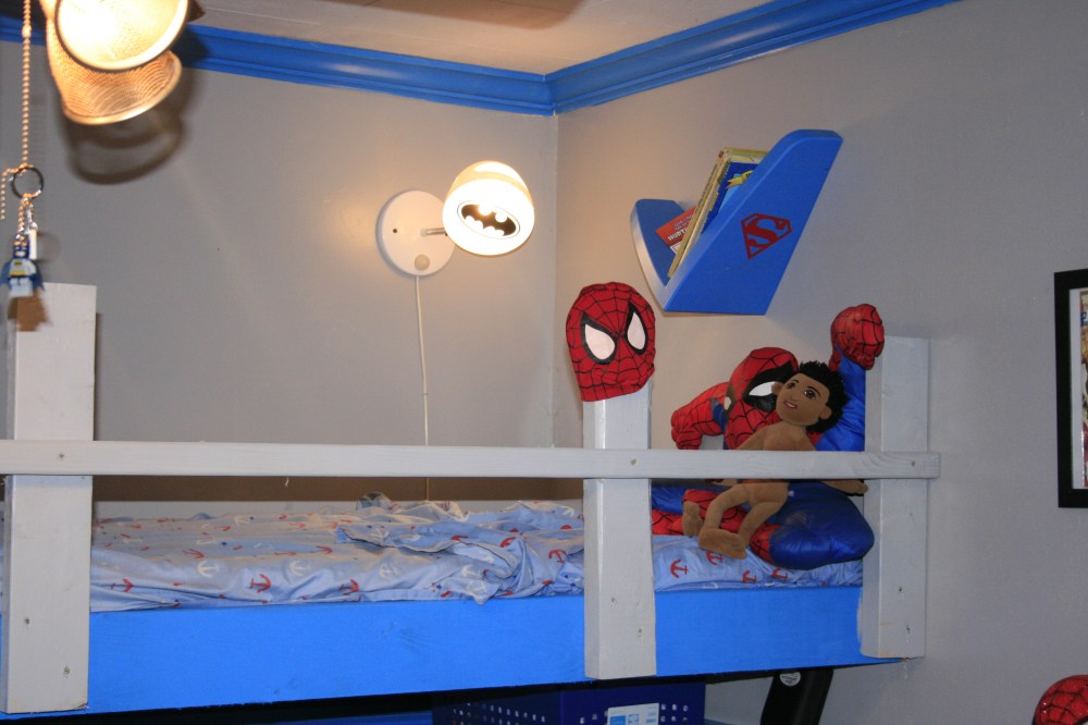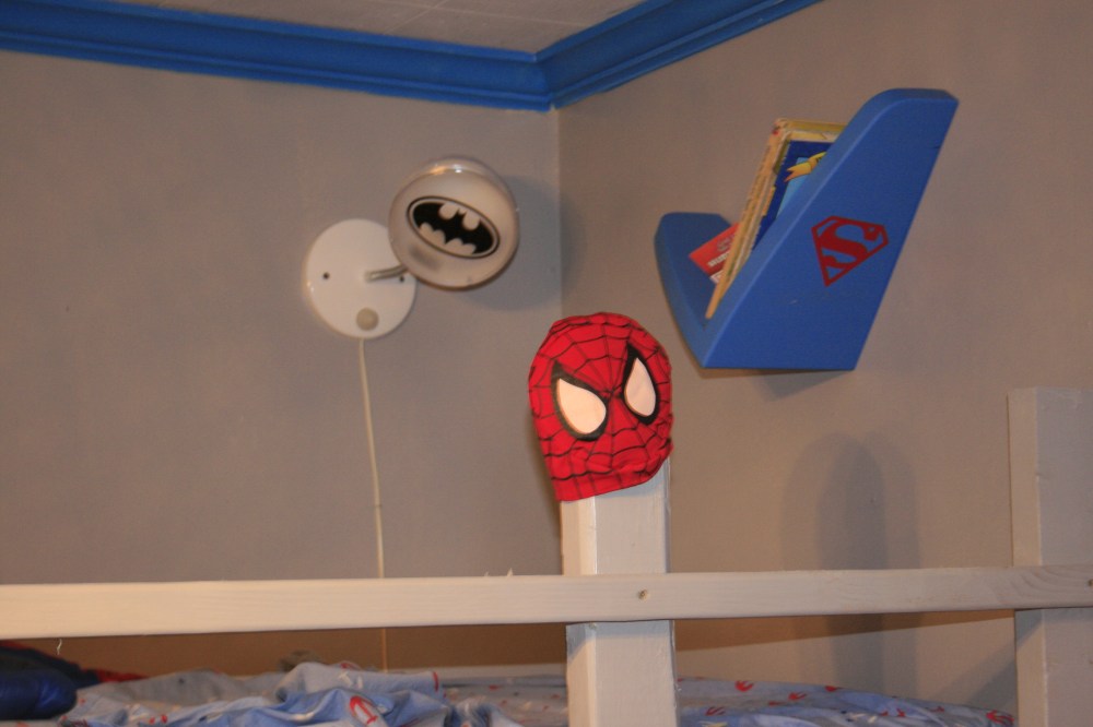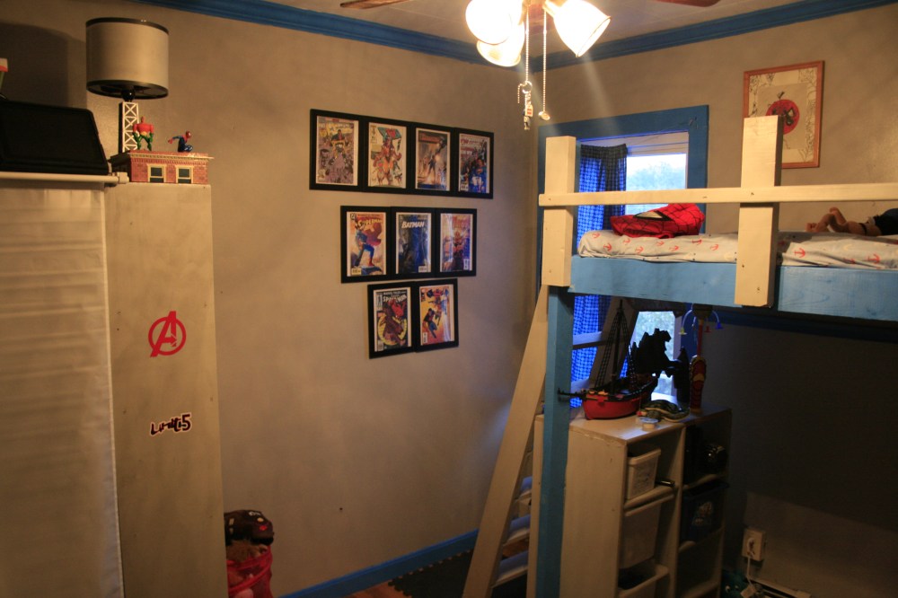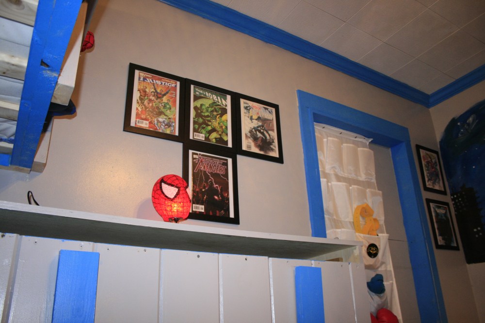 In a world where Big boys strongly dislike little boy rooms…..A hero emerges ( or at least a hero’s room).Little man is coming up on his birthday this week and we decided to give him a big boy bedroom. His idea ( not mine) was to go with superhero theme. After a weekend of hard work and a little help from my girls here are some before and after Pics…..as a note i found that the 1.99 picture frames from Ikea work great for displaying your favorite Comic books….