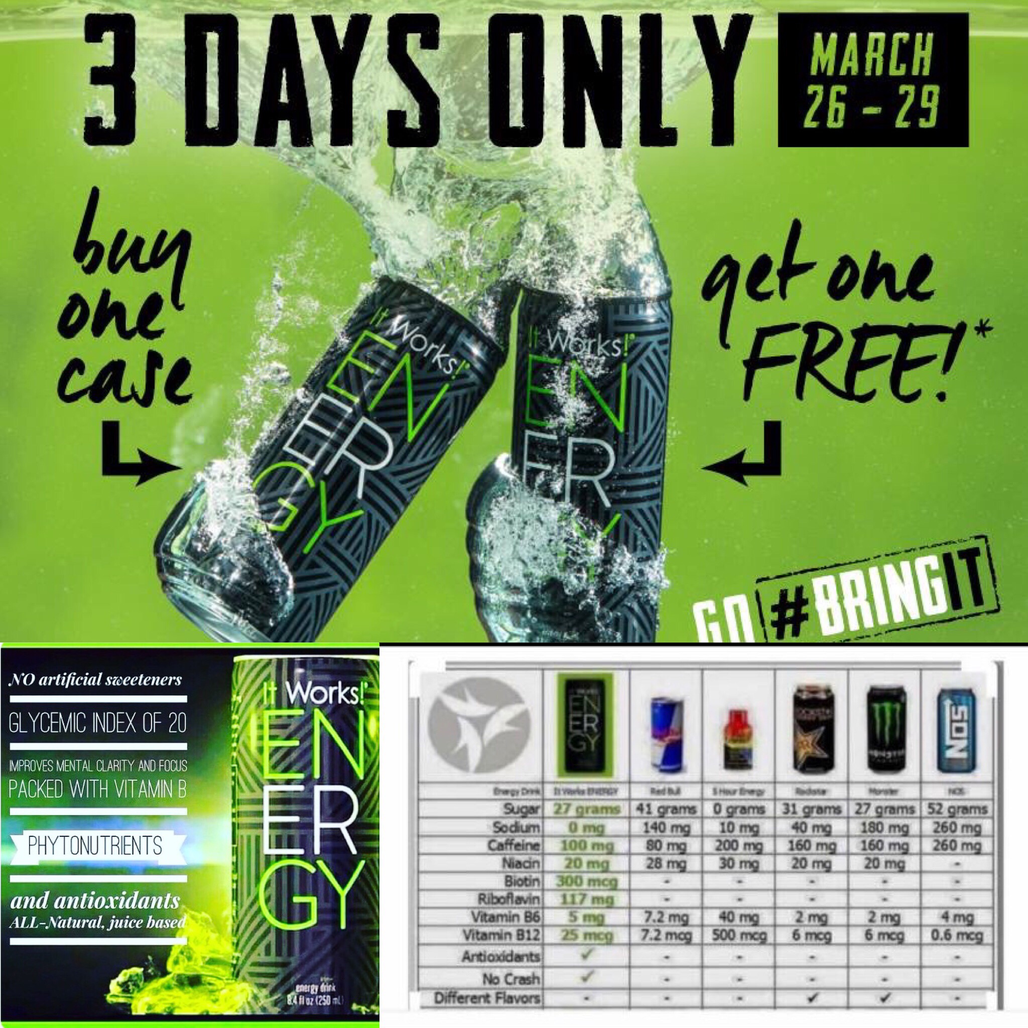 So what exactly does that Energy include which naturally boosts a person’s energy levels for a sustainable period of time? Can it really beat Red Bull or Monster? Well, it all starts with the ingredients. A proprietary blend formulated with green tea extracts, juice concentrate of blueberry, cherry, cranberry, pear, raspberry, as well as strawberry, folic acid, along with Gotu Kola Leaf/Root Extract. It is important to note that Energy has 100 mg of caffeine. This is accomplished by use of a very concentrated dose ofstrong green tea extracts. It’s rich in phytonutrients (natural compounds found in plant foods to promote better health) and polyphenols (abundant micronutrients in our diet with antioxidant property). Picture on the right shows the nutritional facts of It Works Energy drink.